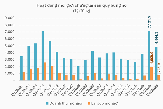 Sau quý 3/2025 bùng nổ, kết quả doanh thu và lợi nhuận mảng môi giới của các công ty chứng khoán đã chững lại trong quý 4/2025.