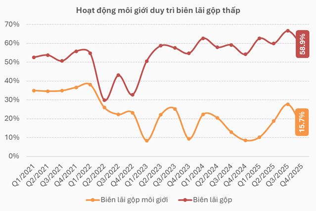 Dù vậy, các kết quả này vẫn tăng trưởng lần lượt 62% và 200% so với cùng kỳ năm 2024. Lũy kế cả năm 2025, ngành chứng khoán mang về hơn 18,547 tỷ đồng doanh thu và hơn 3,732 tỷ đồng lãi gộp môi giới - tăng 32% và 59% so với năm 2024.