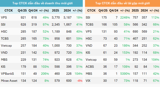 Trên bảng xếp hạng doanh thu môi giới, Chứng khoán VPS tiếp tục dẫn đầu với gần 921 tỷ đồng, tăng 49% so với cùng kỳ và lũy kế cả năm hơn 3,770 tỷ đồng, tăng 18%. VPS vốn đặt trọng tâm vào việc phát triển mảng kinh doanh này, đặc biệt là khách hàng cá nhân, thể hiện qua việc dẫn đầu thị phần môi giới trên các sàn chứng khoán nhiều năm qua, hay gần đây là cá nhân chiếm hơn 98% lượng nhà đầu tư đặt mua cổ phiếu trong đợt IPO hồi tháng 10 - 11/2025.