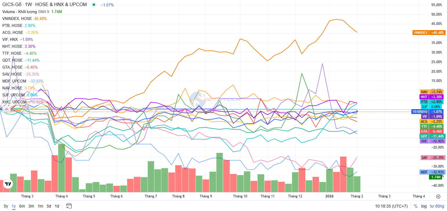 Trên thị trường chứng khoán, ngành gỗ năm 2025 chưa trở thành điểm đến hấp dẫn của dòng tiền. Chỉ số ngành giảm nhẹ 1.15% trong vòng 1 năm, trong khi VN-Index tăng 40.4%. Các mã chủ chốt như PTB, ACG, GDT, SAV, MDF đều giảm giá hoặc tăng trưởng rất thấp so với thị trường chung. Sự thận trọng của nhà đầu tư phản ánh lo ngại về biên lợi nhuận bị bào mòn, rủi ro thương mại và quy mô niêm yết còn hạn chế. Dù vậy, tháng 1/2026 phá đi tín hiệu hồi phục ngắn hạn, trong đó PTB tăng gần 15% trong 1 tháng và khoảng 20% trong 3 tháng, dẫn đầu đà phục hồi của toàn ngành.