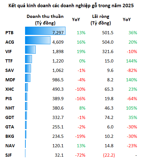 Ở góc độ doanh nghiệp niêm yết, bức tranh tài chính cho thấy sự mở rộng về quy mô nhưng đồng thời bộc lộ rõ mức phân hóa ngày càng sâu sắc. Theo dữ liệu từ VietstockFinance, 14 doanh nghiệp ngành gỗ trên sàn năm 2025 đạt hơn 19,308 tỷ đồng, tăng 8% so với năm trước. Lãi ròng đạt 1,574 tỷ đồng, tăng 9%. Tuy nhiên, mức tăng trưởng này không được phân bổ đồng đều, mà chủ yếu tập trung vào nhóm doanh nghiệp dẫn đầu.