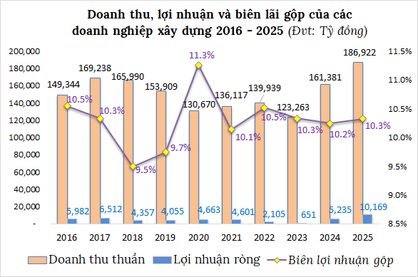 Đà tăng trưởng này giúp năm 2025 khép lại bằng những con số kỷ lục, doanh thu vượt 186.9 ngàn tỷ đồng, tăng 16%; còn lãi ròng hơn 10.1 ngàn tỷ đồng, tăng tới 93%. Một thập kỷ qua, biên lãi gộp của các doanh nghiệp xây dựng duy trì vùng 9.5 – 11.3%.