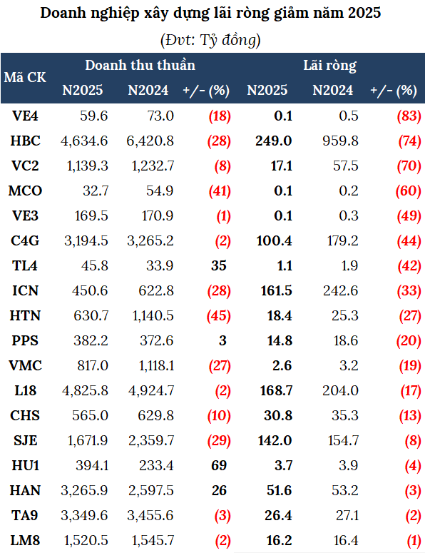 Bên cạnh đó, 18 doanh nghiệp đánh rơi lợi nhuận năm 2025. Trong đó, Tập đoàn Xây dựng Hòa Bình (UPCoM: HBC) giảm 74%, về còn 249 tỷ đồng, hoàn thành 70% kế hoạch năm.