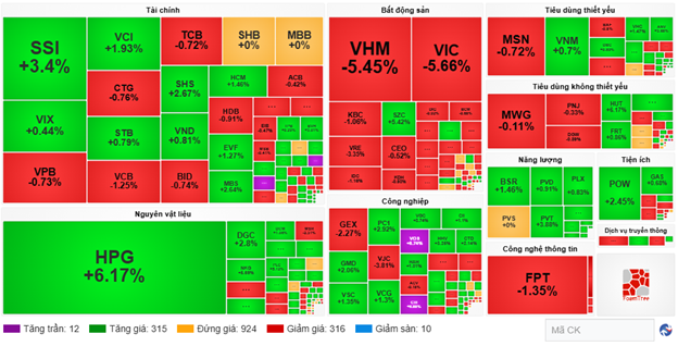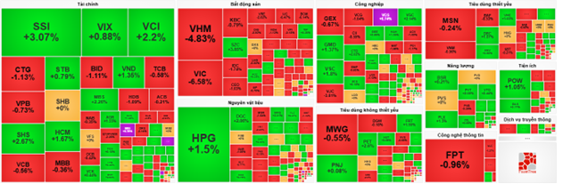 Hầu hết các mã cổ phiếu trong rổ VN30 đều xuất hiện sắc đỏ, nổi bật với VIC giảm 9.63 điểm, VHM giảm 2.73 điểm, VJC giảm 2.45 điểm và FPT giảm 2.18 điểm. Ở chiều ngược lại, chỉ còn HPG, SSI, LPB và STB là những mã vẫn giữ được sắc xanh góp phần níu giữ hơn 6 điểm.