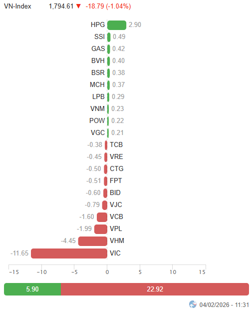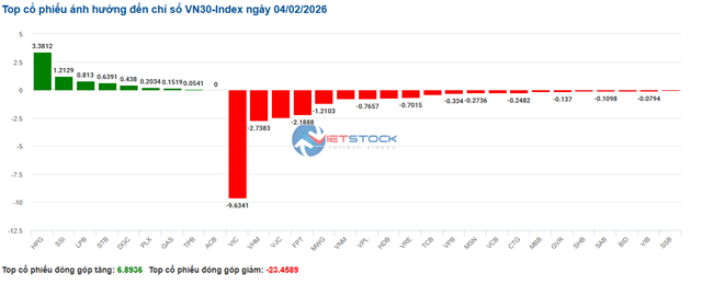 | Top 10 cổ phiếu tác động mạnh tới VN-Index phiên sáng 04/02/2026 (tính theo điểm) | ||