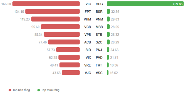 Khối ngoại bán ròng với giá trị 172.23 tỷ đồng trên cả ba sàn. Lực bán tập trung mạnh ở hai cổ phiếu là VIC và FPT với giá trị lần lượt là 166 tỷ và 134.15 tỷ. Trong khi đó, dẫn đầu top mua ròng là HPG với giá trị lên đến 759.88 tỷ đồng, bỏ xa các cổ phiếu còn lại.