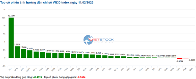 | Top 10 cổ phiếu tác động mạnh tới VN-Index phiên 11/02/2026 (tính theo điểm) | ||