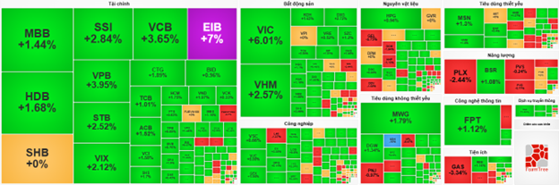 Nhóm cổ phiếu ngành tài chính với sắc xanh lan tỏa kèm theo mức tăng 1.84%. Trong đó, EIB tăng 7%, SSI tăng 3.01%, VCB tăng 3.8%, VPB tăng 3.95%...