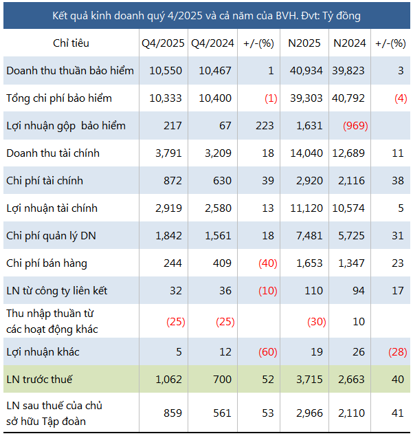 Quy mô lợi nhuận của Tập đoàn Bảo Việt (HOSE: BVH) trong quý 4 và cả năm 2025 đều được gánh vác bởi danh mục đầu tư tài chính khổng lồ.