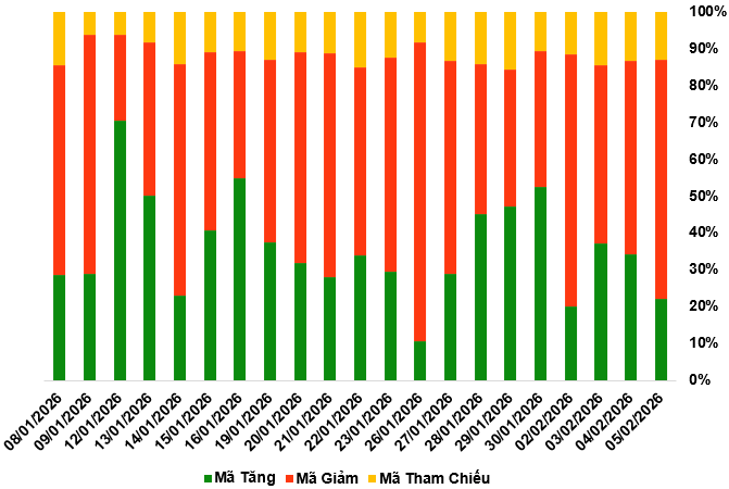 Kết thúc phiên giao dịch ngày 05/02/2026, toàn thị trường có 72 mã tăng, 213 mã giảm và 41 mã tham chiếu.