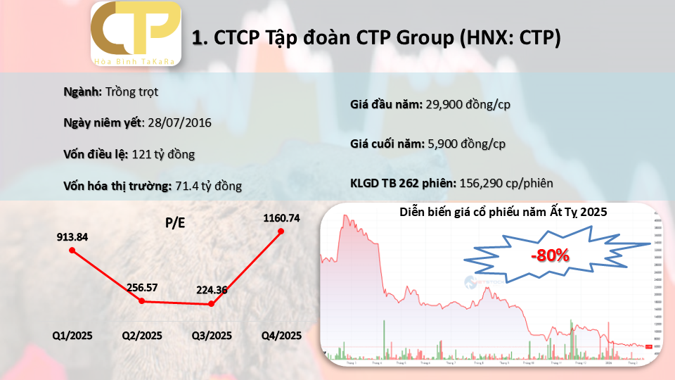Sau Tết Nguyên đán 2025, cổ phiếu CTP đã có đợt tăng để tìm lại đỉnh lịch sử, tuy nhiên sau khi dừng tạo đỉnh vào cuối tháng 2, giá cổ phiếu này trượt dốc không phanh và chỉ còn chưa đến 6,000 đồng/cp vào phiên cuối cùng của năm Ất Tỵ. |