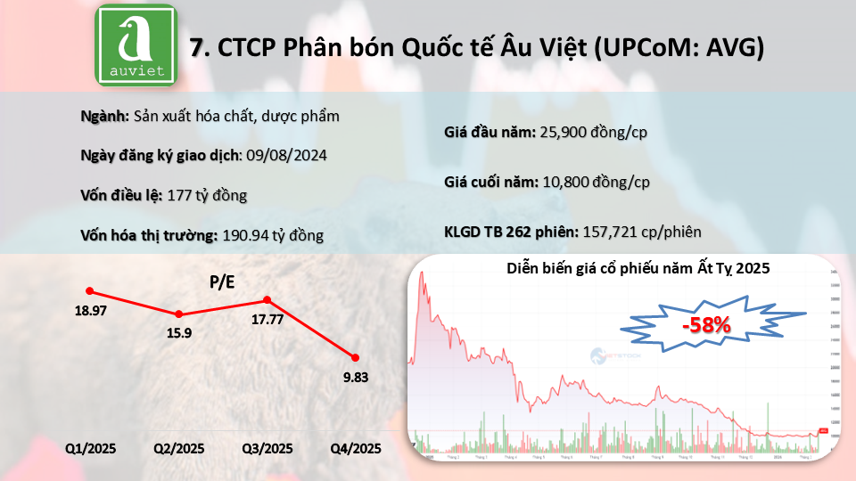 Sau khi đạt đỉnh lịch sử 34,000 đồng vào cuối năm 2024, giá cổ phiếu AVG bước vào chuỗi ngày giảm điểm và hiện đã áp sát mức mệnh giá 10,000 đồng/cp. |