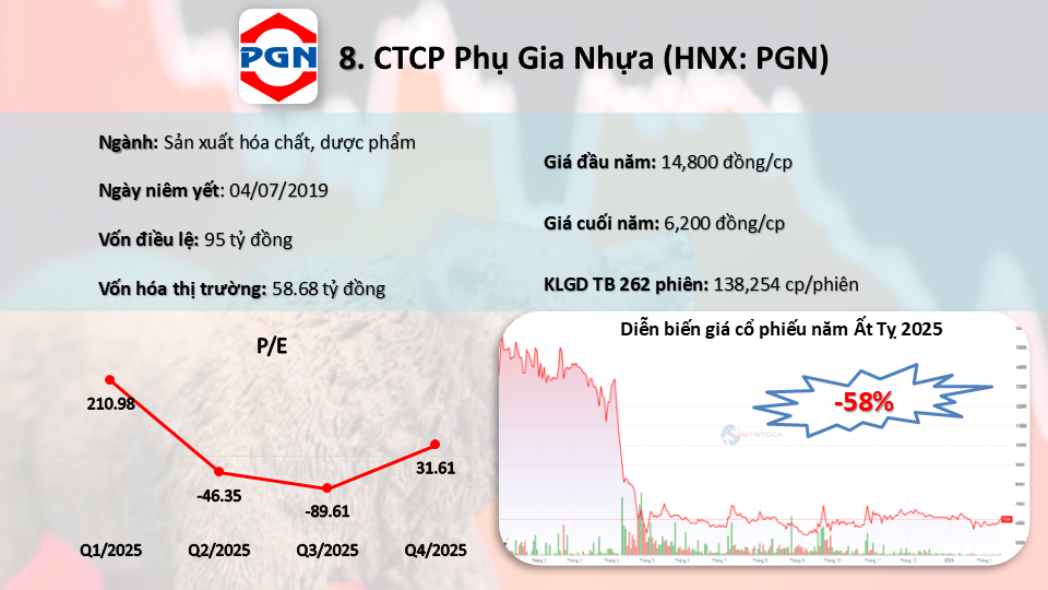 Tương tự diễn biến của AVG, giá cổ phiếu PGN sau khi lập đỉnh lịch sử vào cuối năm 2024 đã ghi nhận cú “rơi tự do” trong tháng 4/2025, khiến thị giá nhanh chóng về dưới mốc 7,000 đồng/cp. |