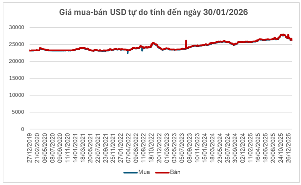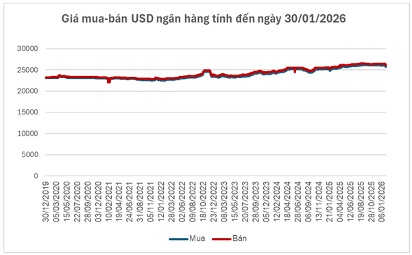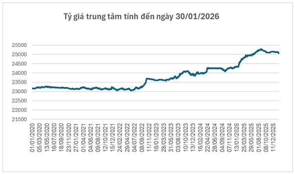 Những biến động trên thị trường quốc tế nhanh chóng phản ánh lên thị trường ngoại hối trong nước. Tính đến ngày 30/01, Ngân hàng Nhà nước hạ tỷ giá trung tâm xuống 25,074 đồng/USD, giảm 51 đồng so với tuần trước, qua đó kéo biên độ giao dịch tại các ngân hàng thương mại về mức 23,820–26,328 đồng/USD.