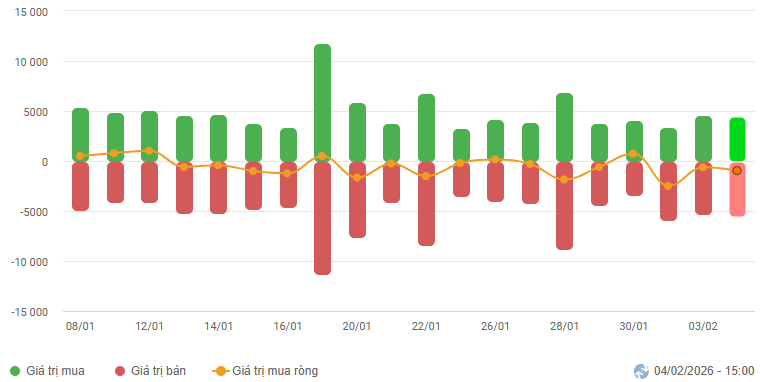 Biến động của dòng tiền từ khối ngoại: Khối ngoại bán ròng trong phiên giao dịch ngày 04/02/2026. Nếu nhà đầu tư nước ngoài duy trì hành động này trong những phiên tới thì tình hình sẽ càng bi quan hơn.