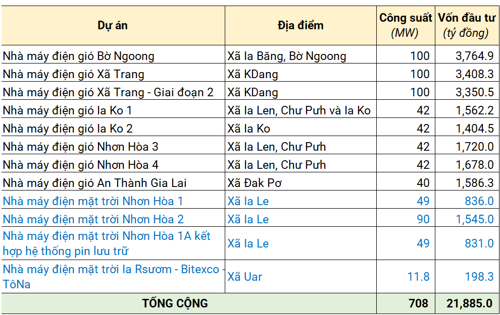 Hồi giữa tháng 1, Sở Tài chính Gia Lai thông báo chuẩn bị mời quan tâm đầu tư 12 dự án nhà máy điện gió, điện mặt trời với tổng công suất gần 708MW, vốn đầu tư gần 21.9 ngàn tỷ đồng.